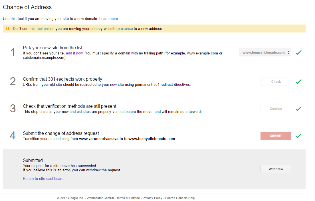 Last but not least, you will have to notify google about your domain migration. This is very easy. You can notify google from webmasters admin console. Follow below steps to submit a request at webmaster console,