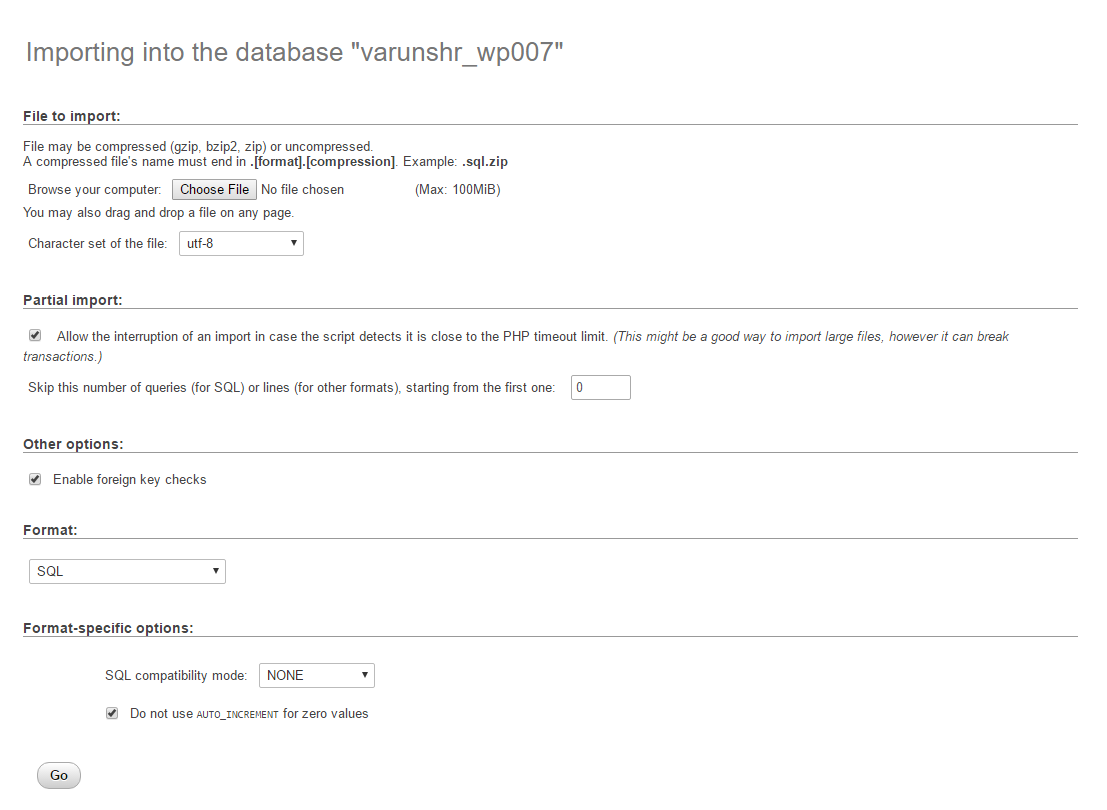 It is really simple, select the database and click import button from the tab. It will take you to a file import view. Use the file select to select the file and upload it. Refer the snapshot below.